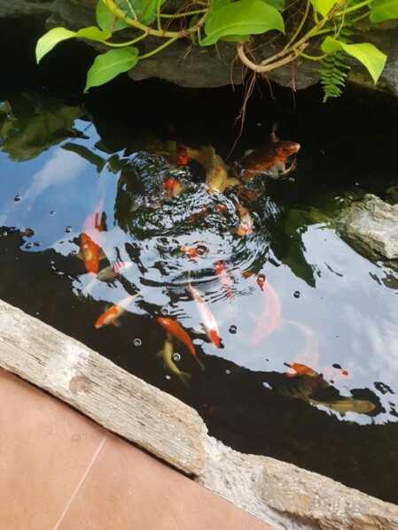 Wasserfall an dessen Fuß sich exotische Fische tummeln. Ein Auswanderer hatte